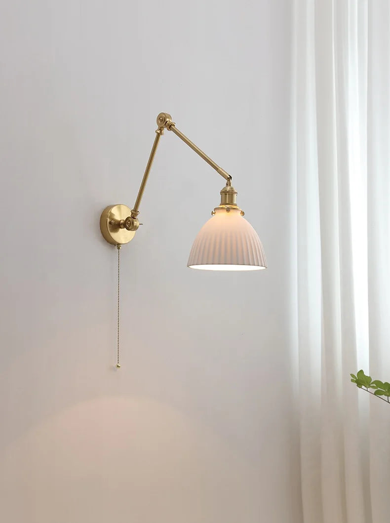 Diese Variante bringt die gleiche warme Eleganz mit, wirkt aber durch den weich gewölbten Keramikschirm noch sanfter. Das Licht fällt besonders harmonisch und warm, ideal für ruhige Ecken und stimmungsvolle Abende. Der schwenkbare Arm lässt sich flexibel einstellen, sodass du die Lichtwirkung ganz intuitiv an deine Atmosphäre anpassen kannst.